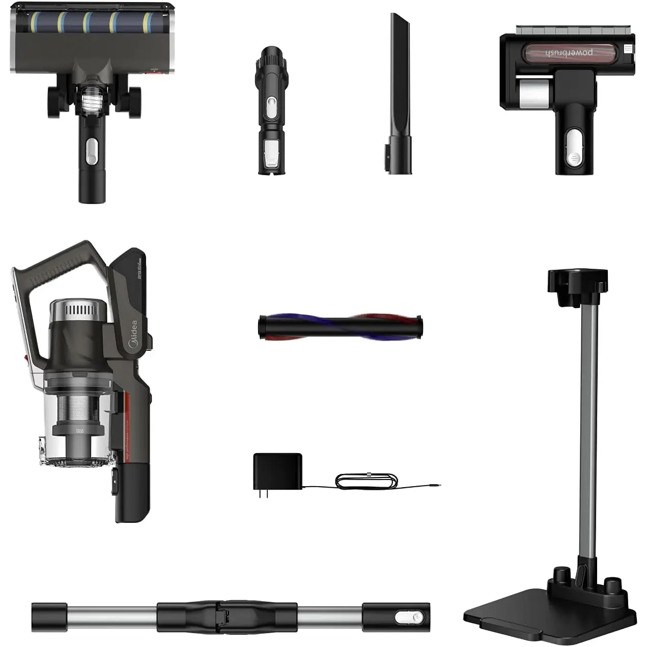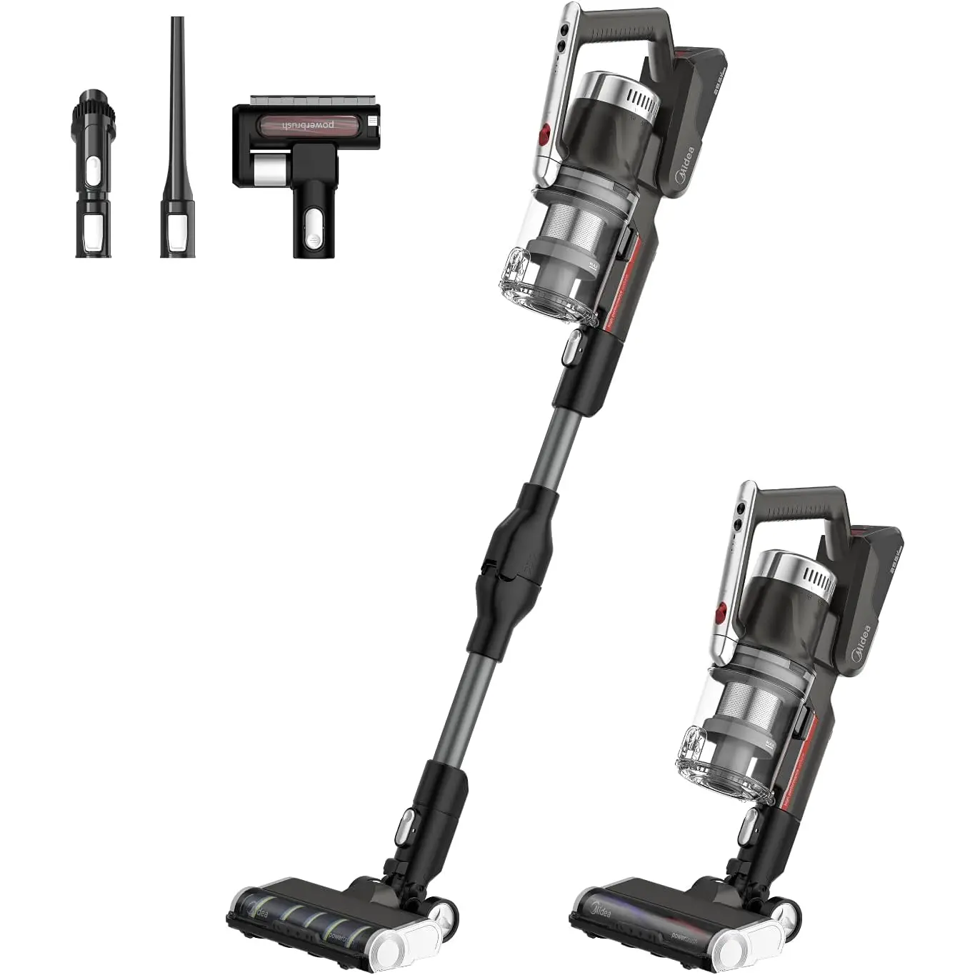 Midea P7 MCS2129BR (P7 Flex) არის უსადენო, 2‑in‑1 სტიკ და ხელით მოსაკიდი მტვერსასრუტი სწრაფი ჩართვით და ბენდავშებადი მილით. აღჭურვილია ძლიერი 450 W BLDC ძრავით, რომელიც შეუძლია შექმნას 150 AW მძლავრი დახრილი მოზიდვა (25 000 Pa). მუშაობის დრო ერთ დამუხტვაზე — დაახლოებით 70 წუთი, რაც იძლევა ვრცელი ფართების ერთჯერად კონტაქტს. მოწყობილობა იწონის მხოლოდ ≈2.3 კგ, რაც კომფორტულ და მობილურ ექსპლუატაციას უზრუნველყოფს. აქვს ოთხ სტადიიანი HEPA ფილტრაცია და 0.65 ლ მოცულობის მტვრის კონტეინერი ანტიბაქტერიული მასალით. LED განათება საშუალებას იძლევა კარგად დაინახოთ მუქ კუთხეები, მცირე ელემენტების დეტალური გაწმენდა. კომპლექტში შედის ორი განსხვავებული როლერი (ხალიჩისთვის და მყარ იატაკისთვის), ათვალზე დასადგამი საწყობი, ჯავშის ჯაგრისი და დანარჩენი გამოცოცხალ დასუფთავებაზე ორიენტირებული აქსესუარები. ხმაურის დონე ≈79 dB, დამუხტვის დრო – დაახლოებით 6 საათი. მოდელი განსაკუთრებით გამოსადეგია მყარი ჭერის, ავეჯის ქვეშ და მატრასებისათვის.